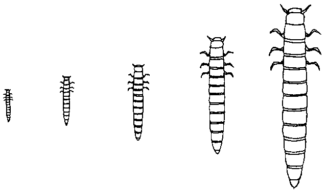 Figura 24. Fases de desarrollo o estadios de la larva, de un Tenebrionidae (Coleóptero).