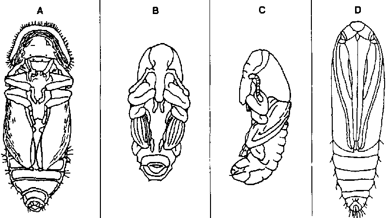 Las características de la pupa dependen del Orden a que pertenece. Las pupas de lepidópteros o crisálidas, son muy diferentes a los adultos, mientras que en los coleópteros es más fácil observar algunas partes del futuro adulto (Figura 26).