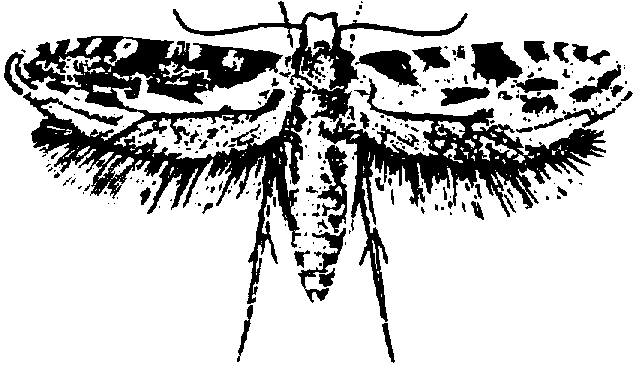 Figura 79. Palomilla o pollita mediterránea. Ephastia (Anagaste) kehniella (Zeller). Adulto y larva.