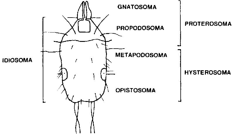 Debido a la dificultad para diferenciar la cabeza, tórax y abdomen de los ácaros, se emplea una nueva nomenclatura, que reemplaza la anterior de cefalotórax y abdomen (Figura 84).