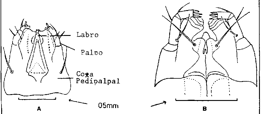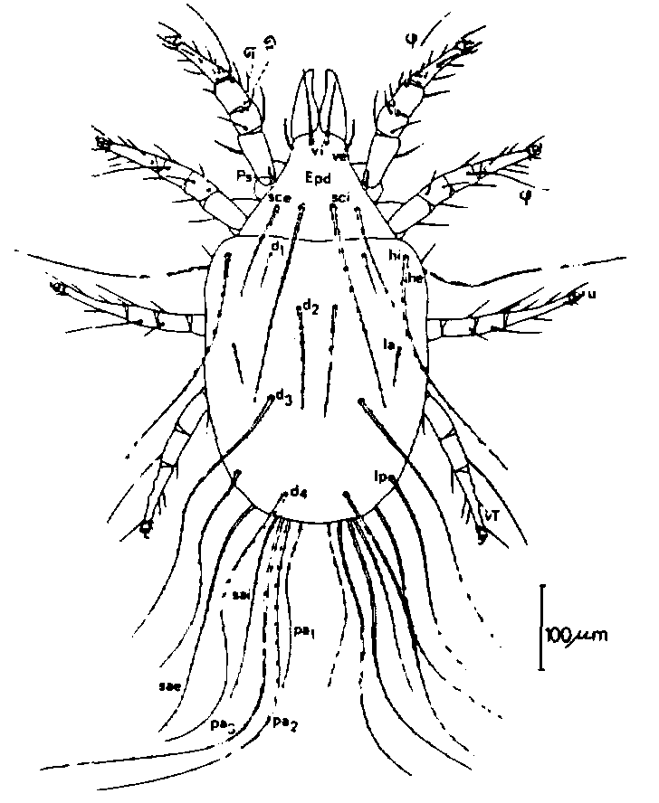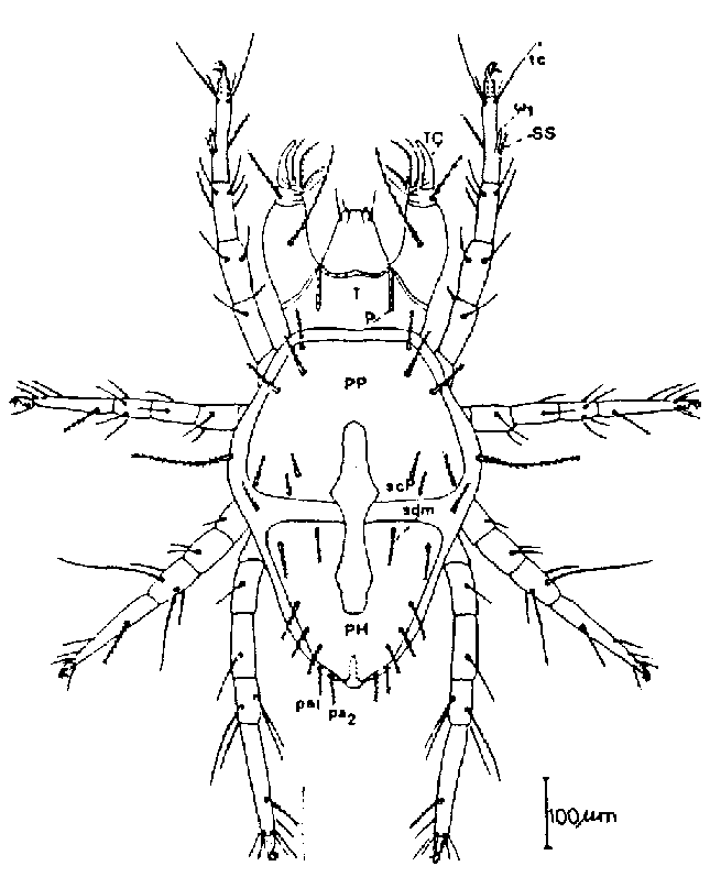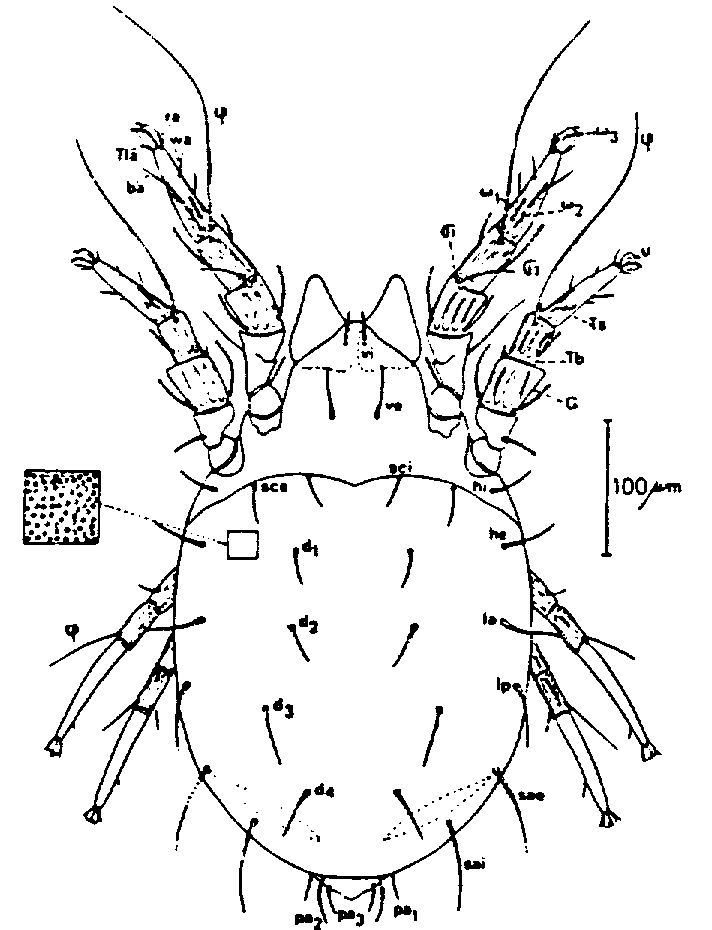 DESCRIPCION: El largo del idiosoma del macho homomórfico mide entre 600 a 900 micrones, el del macho heteromórfico de 700 a 1.000 y el de la hembra de 800 a 1.000 micrones. La cutícula es lisa, incolora y brillante. Los apéndices son de color café pálido. La placa dorsal del propodosoma es ligeramente cóncava en el margen posterior. El gnatosoma es delgado y ahusado. Las patas son delgadas terminando en una uña con un pretarso bien desarrollado. (Figura 94).