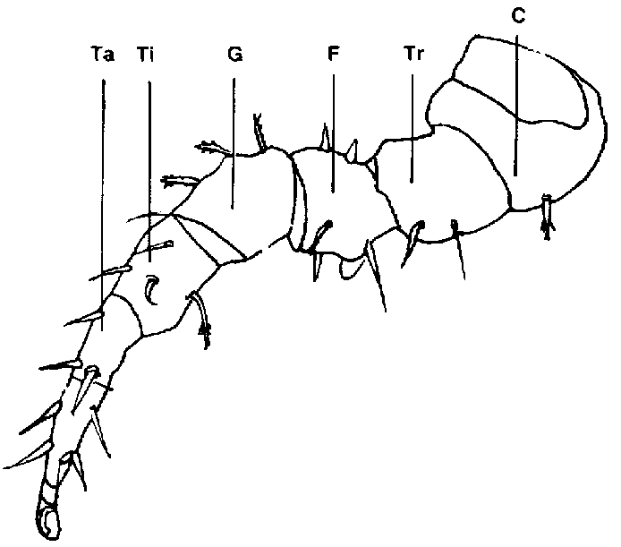 Los adultos tienen ocho patas cada una compuesta de seis segmentos (Figura 86): coxa, trocánter, fémur, gena, tibia y tarso, unidos por membranas artrodiales. En algunos casos puede reducirse el número de segmentos, la coxa está incorporada dentro de la superficie ventral del idiosoma formando una placa.