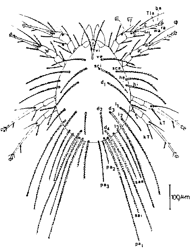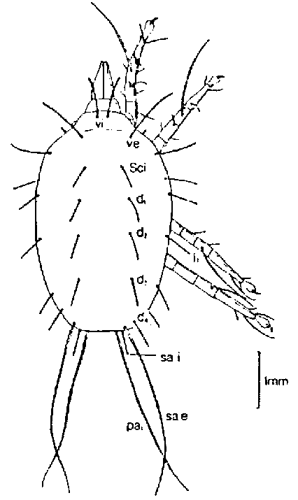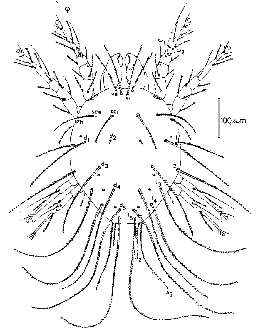 La placa dorsal del propodosoma es casi de forma triangular y parcialmente cubre la parte del gnatosoma.