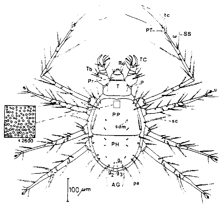 DESCRIPCION: Idiosoma globoso, levemente más largo que ancho, margen anterior recto, cutícula rugosa con pequeñas papilas; quelíceros grandes, patas mas cortas que el idiosoma, sin uñas visibles y tarsos alargados. (Figura 96).