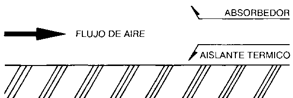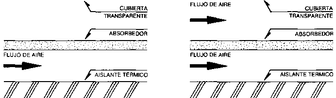 Los colectores solares planos de superficie absorbedora suspendida se caracterizan por el paso del flujo de aire por debajo o por los costados de la superficie absorbedora (Figura 14). Son más eficientes que los anteriores y presentan una concepción diferente en cuanto a la forma de la superficie absorbedora, la que puede ser lisa o corrugada.