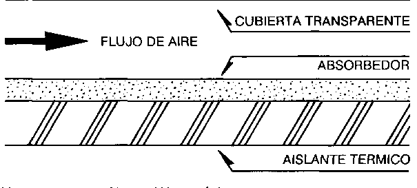 Los colectores almacenadores de energía solar con cubierta transparente (Figura 16) acumulan una parte de la energía solar en forma de calor sensible, en un lecho de piedras por ejemplo, que actúa como superficie absorbedora, atenúando las elevaciones bruscas de temperatura y promoviendo la estabilidad relativa de sus incrementos. El colector almacenador continúa calentando el aire durante cierto tiempo después de la puesta de sol, debido a la temperatura almacenada en el lecho absorbedor. la magnitud de dicho incremento de temperatura y de los períodos adicionales de funcionamiento del sistema dependen de varios factores, talos como: flujo de aire, radiación solar incidente, espesor del lecho de piedras y otros detalles de la construcción del colector.