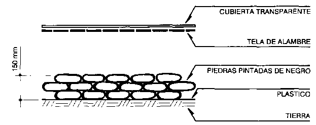 e) Los materiales que están en contacto con el suelo deben ser resistentes a la corrosión. En el colector-almacenador hay que colocar un plástico entre el lecho de piedras y el suelo, para evitar el desarrollo de hierbas dañinas y de hormigueros.