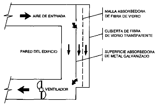El colector de este tipo alcanza eficiencias medias de 12% con la superficie sin pintura y de 30% con la superficie pintada de negro opaco. El aprovechamiento de superficies verticales, como las de silos y muros, reviste mayor interés en las latitudes mayores que en las reglones próximas al ecuador. El costo fijo de estos colectores puede disminuir si no se emplea aislación térmica (PIACENTINI y CORTES, 1983).
